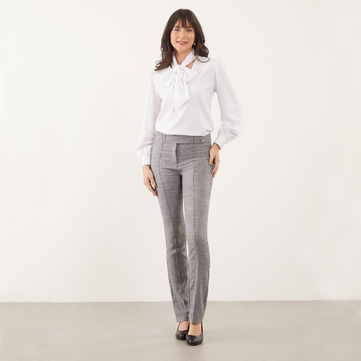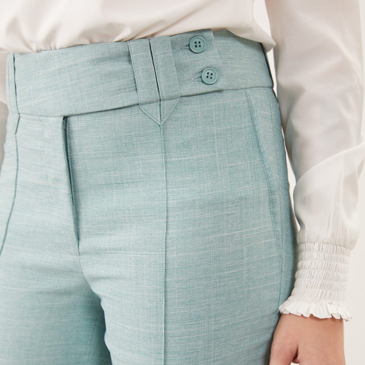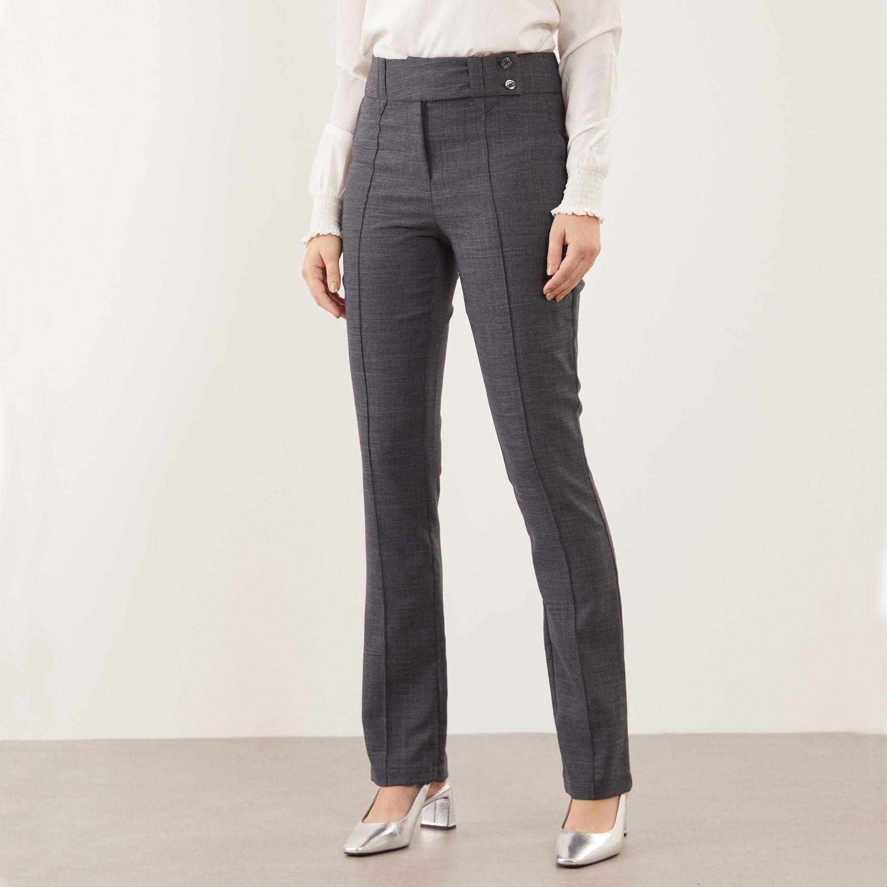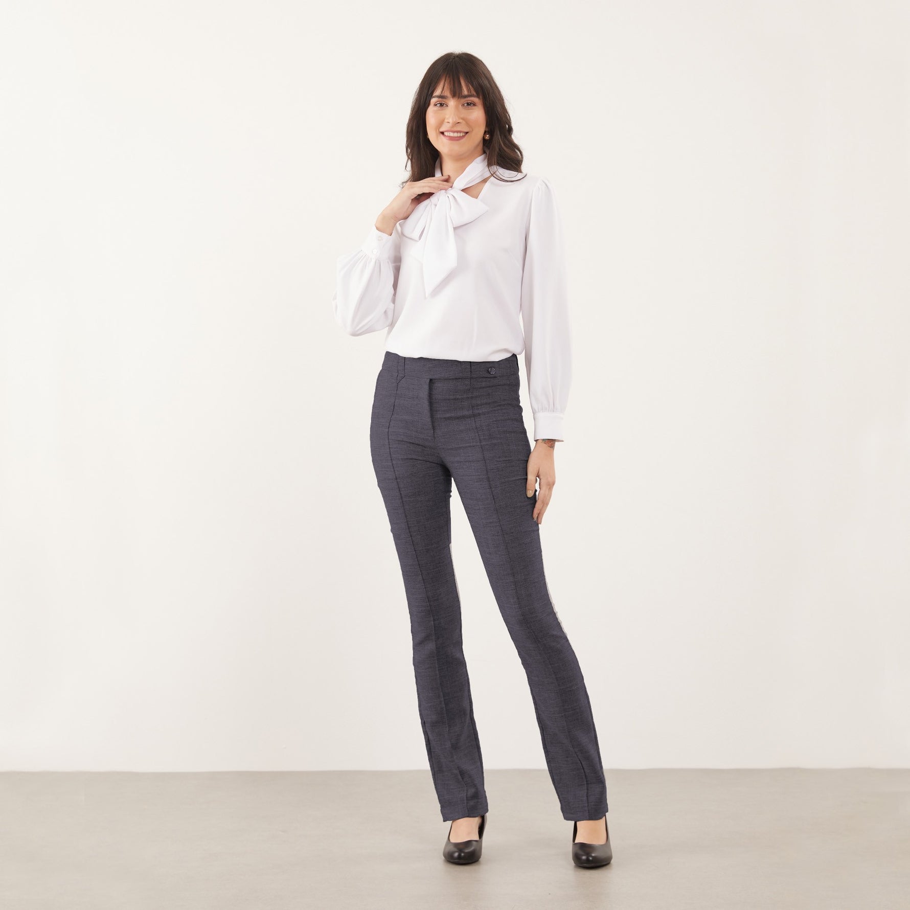 A Calça Feminina Clássica Maria Alice possui cós trespassado com passante e abotoamento de dois botões, trazendo um detalhe moderno à peça clássica.