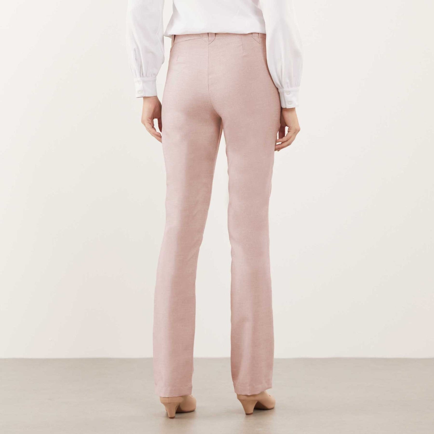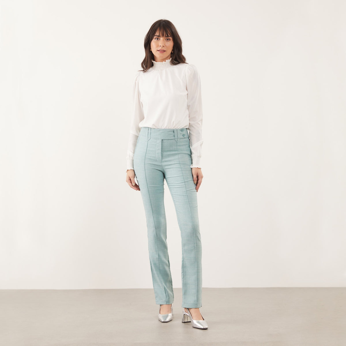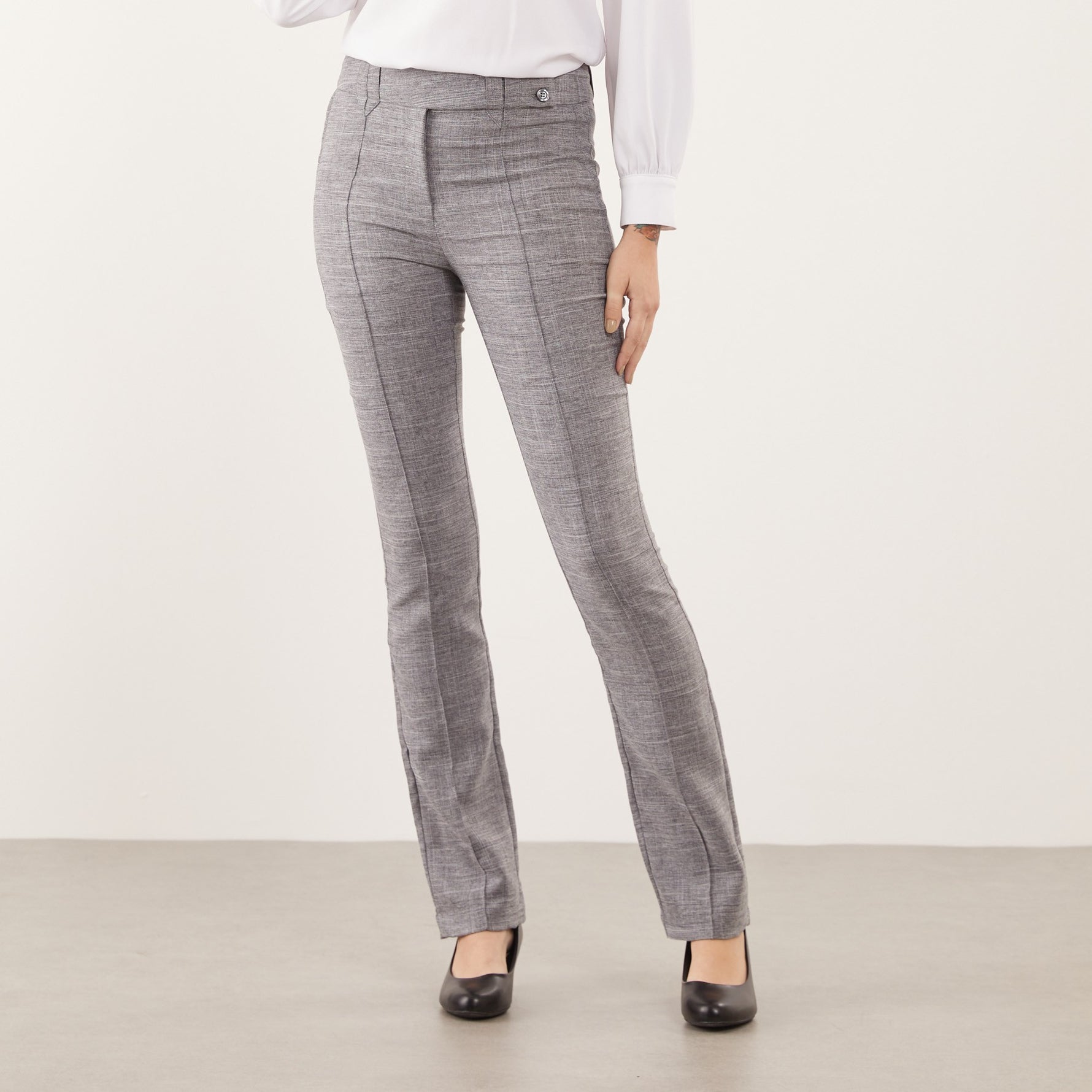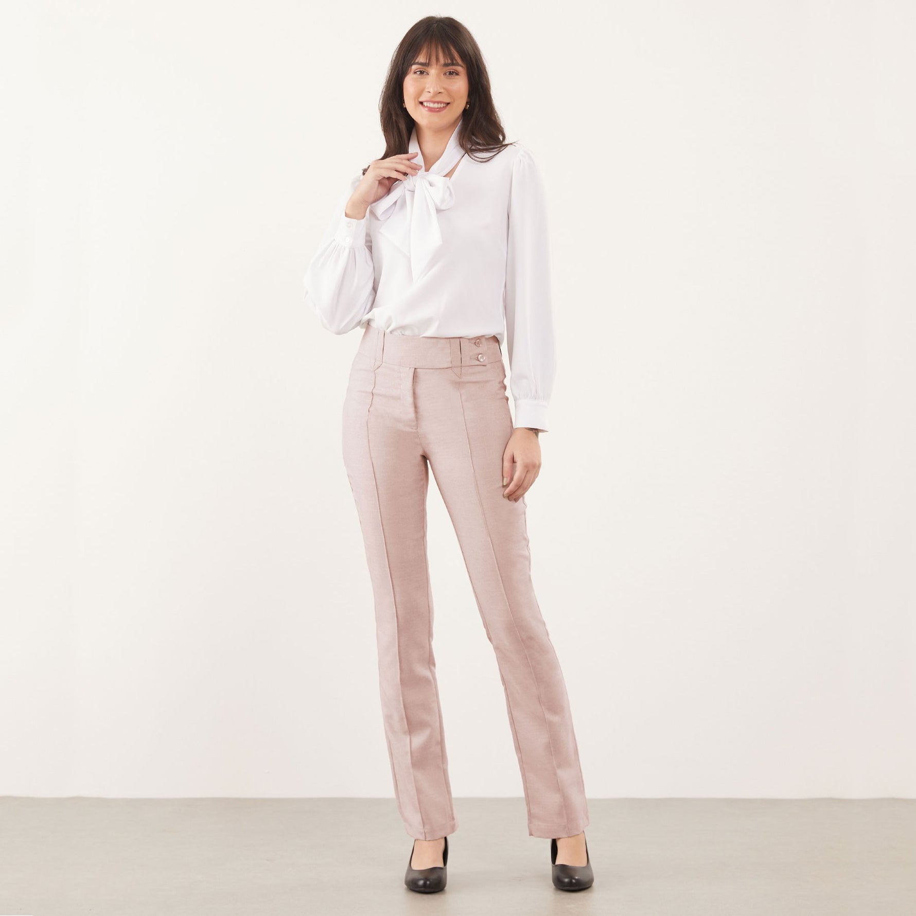 A Calça Feminina Clássica Maria Alice possui cós trespassado com passante e abotoamento de dois botões, trazendo um detalhe moderno à peça clássica.