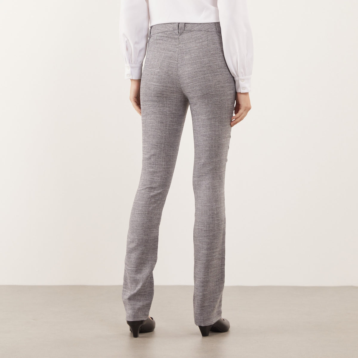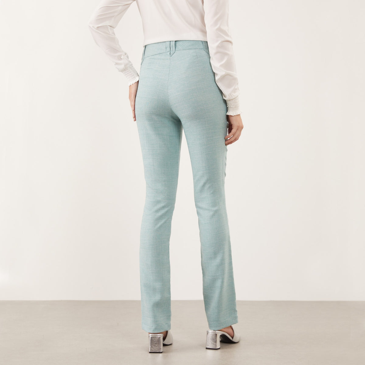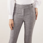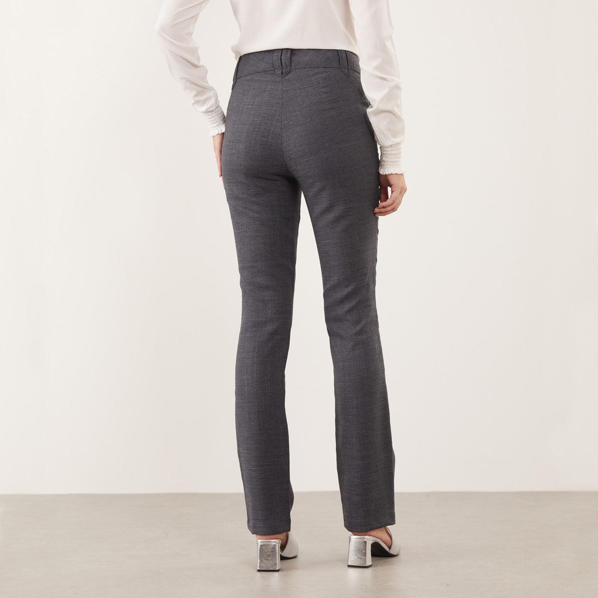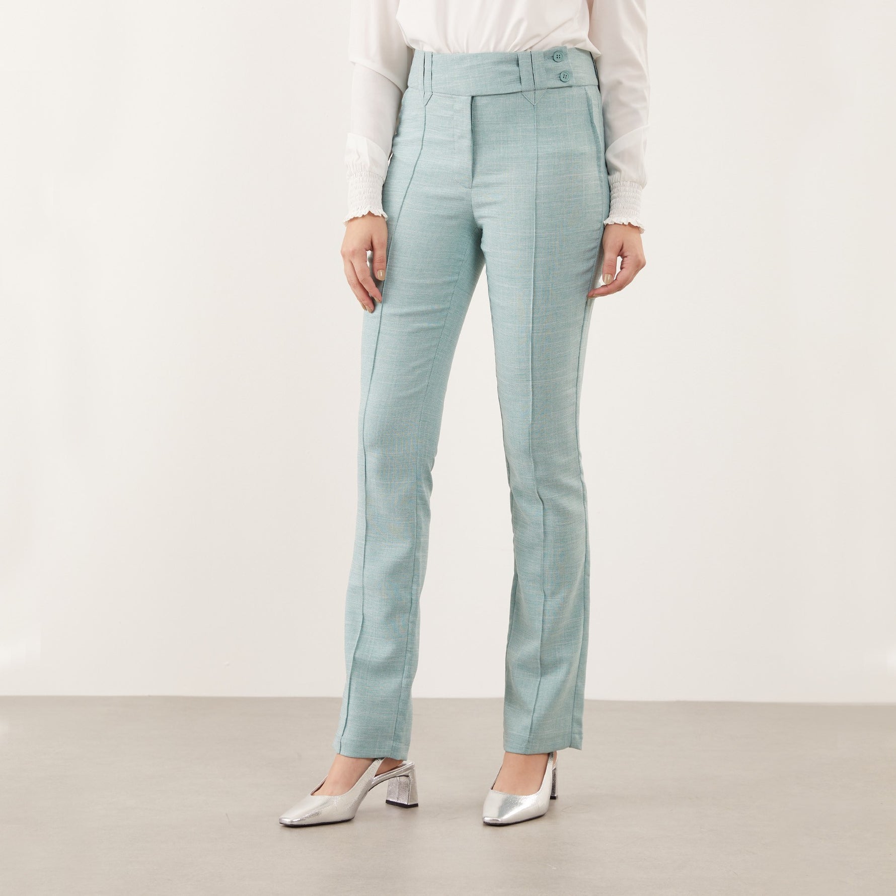 A Calça Feminina Clássica Maria Alice possui cós trespassado com passante e abotoamento de dois botões, trazendo um detalhe moderno à peça clássica.