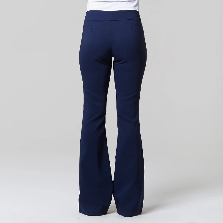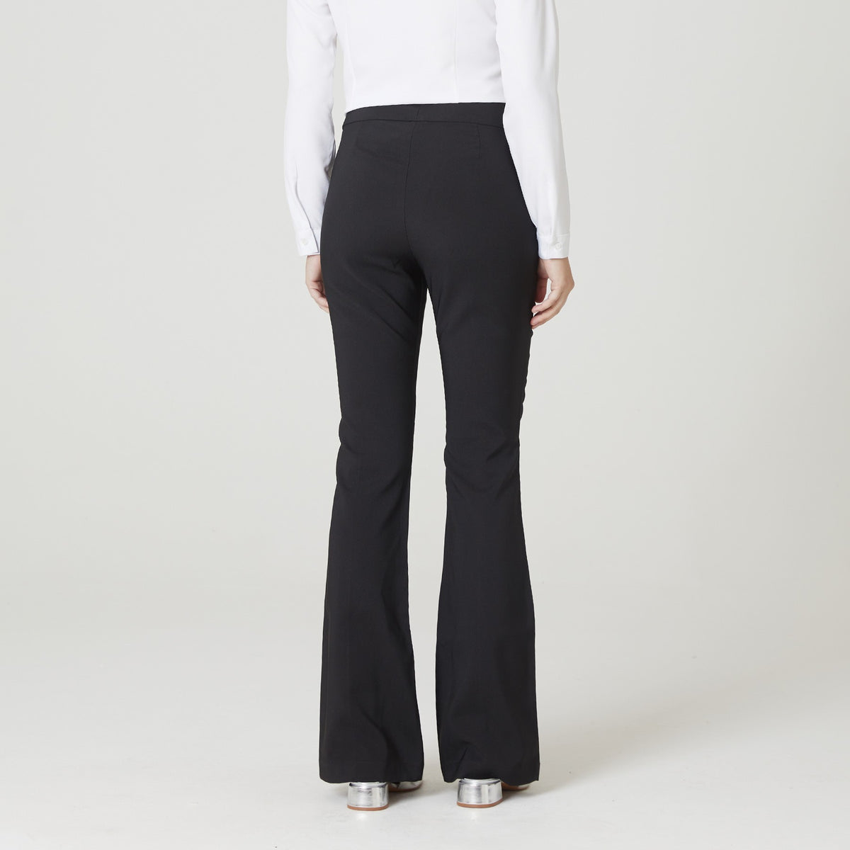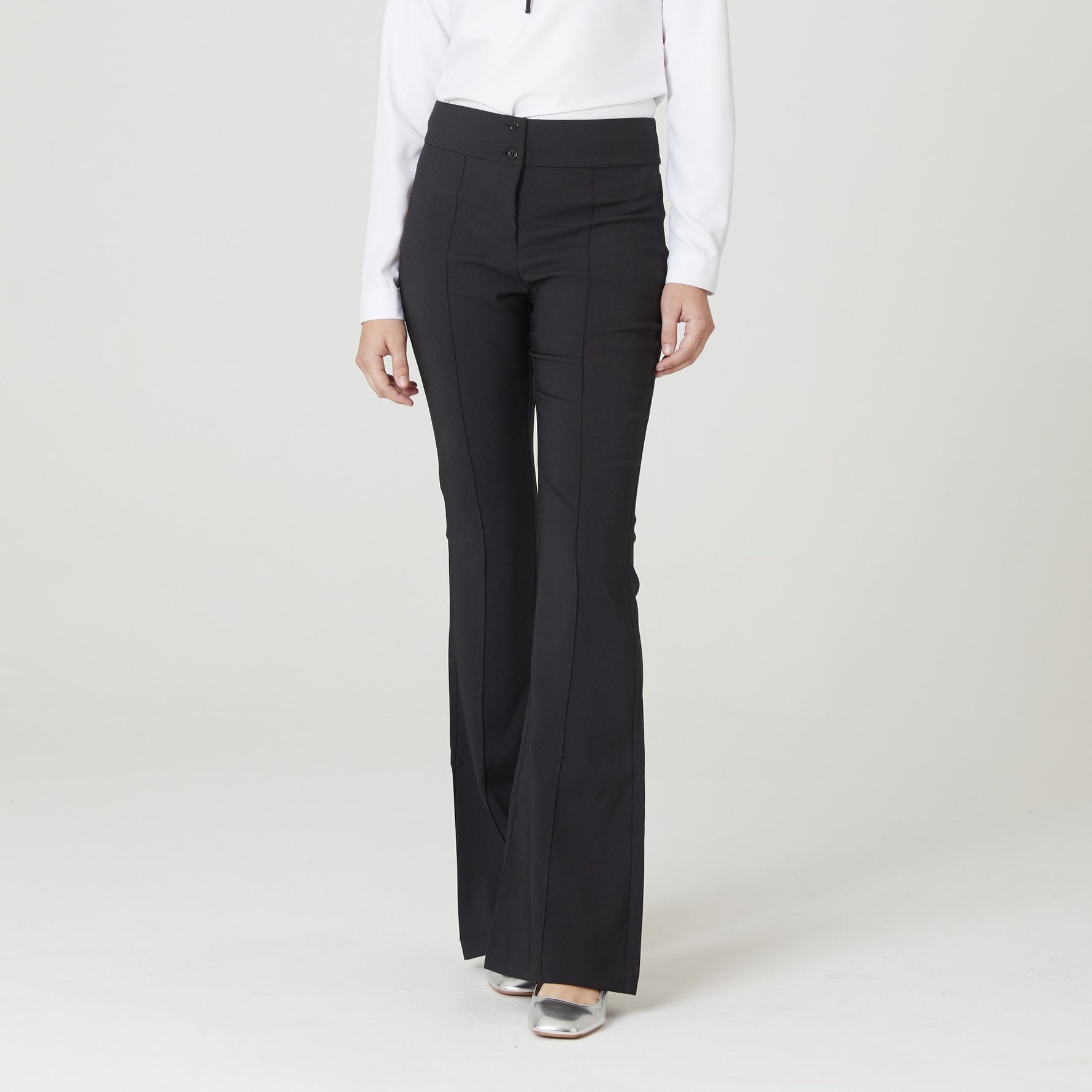A sua modelagem é flare, o que significa que ela é ajustada na parte superior e se alarga gradualmente a partir dos joelhos até a bainha. Esse corte ajuda a alongar visualmente as pernas e equilibrar a silhueta.