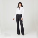 Modelagem Flare - Esse corte ajuda a alongar visualmente as pernas e equilibrar a silhueta.