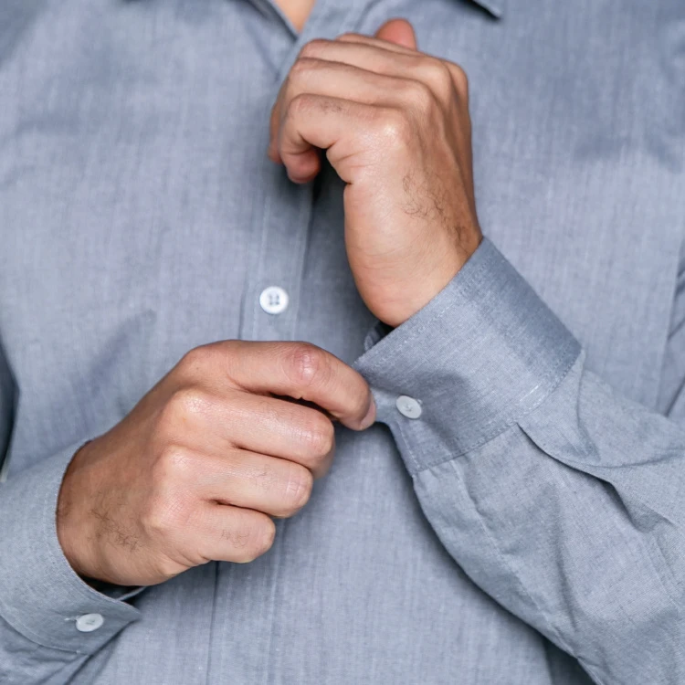 A camisa possui um abotoamento frontal simples, isso permite fácil colocação e remoção da peça, além de dar um aspecto limpo e organizado.