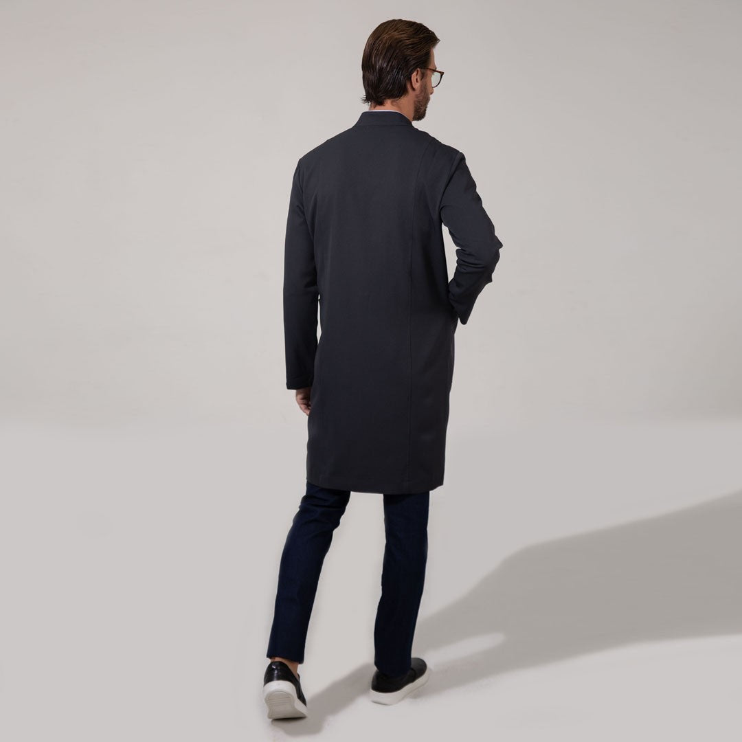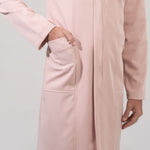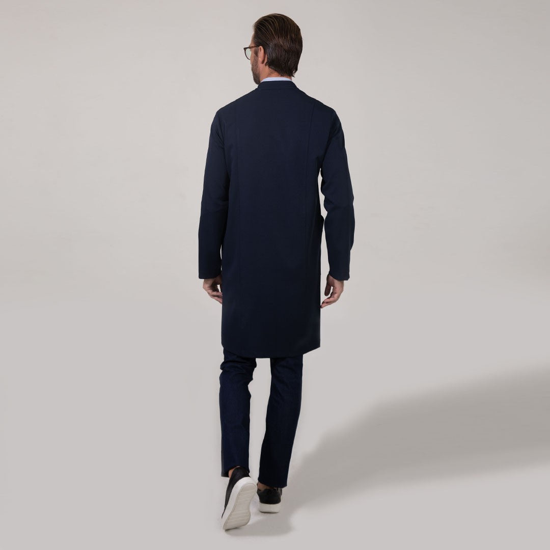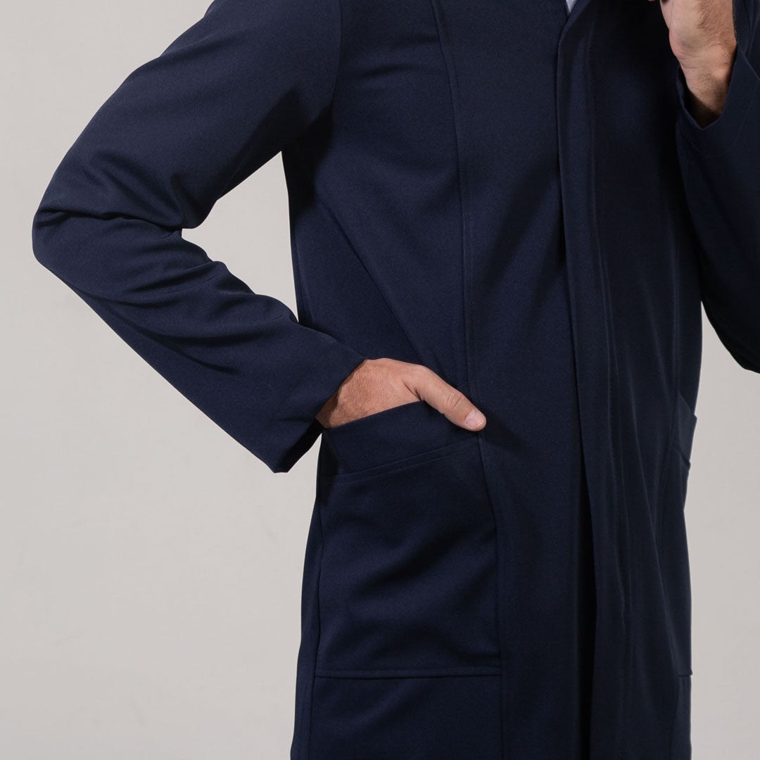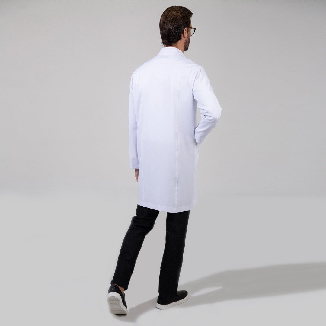 O jaleco também apresenta um recorte no tronco, o que contribui para uma modelagem mais ajustada ao corpo, proporcionando conforto ao profissional durante o uso. Além disso, possui um zíper frontal, facilitando o ato de vestir e remover o jaleco.