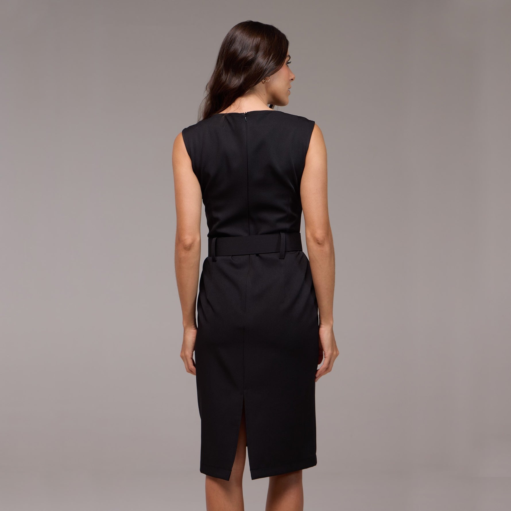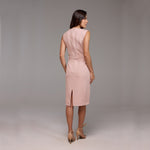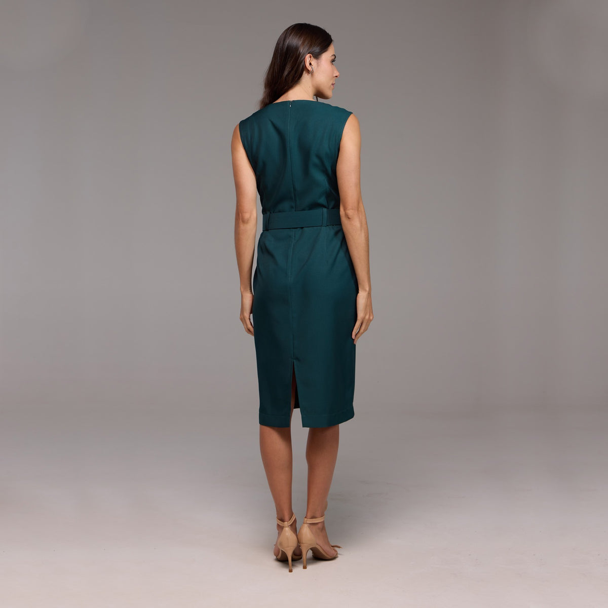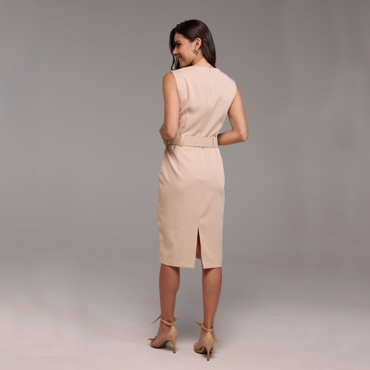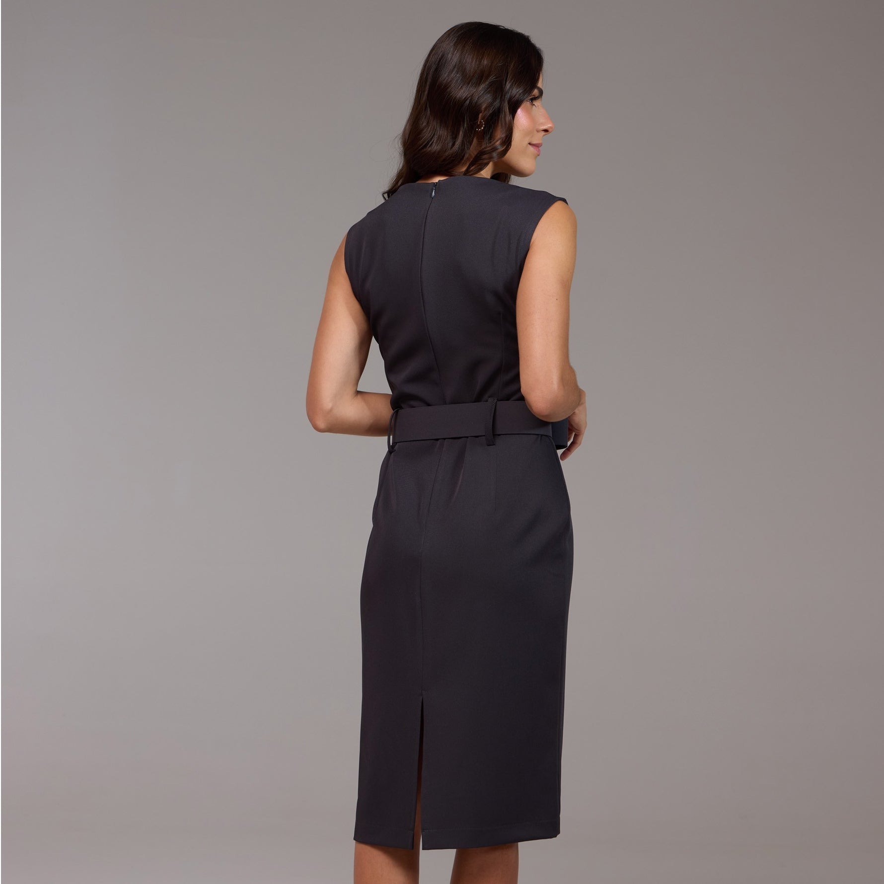 Sem mangas, o vestido realça os ombros, proporcionando uma aparência discreta e fresca para dias mais quentes. Além disso, possui uma fenda sutil na parte de trás, adicionando um toque de sofisticação e revelando uma pitada de elegância.
