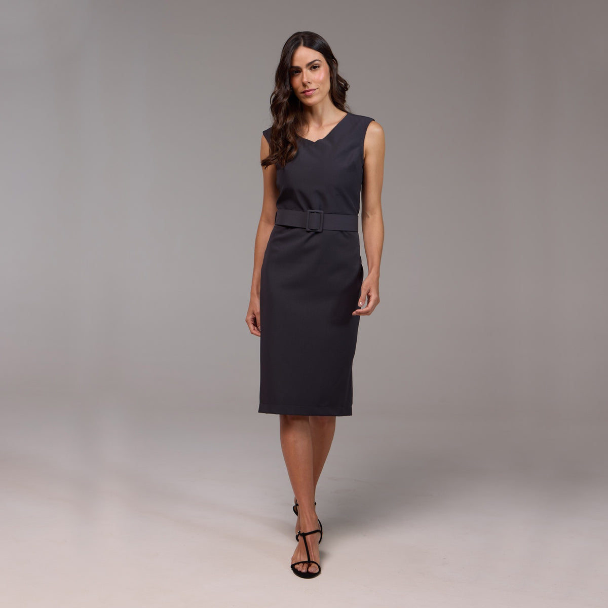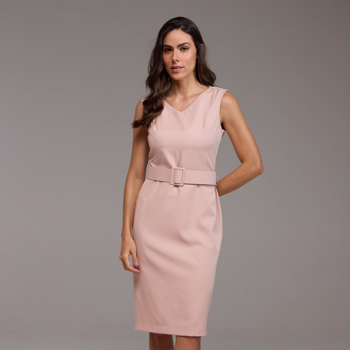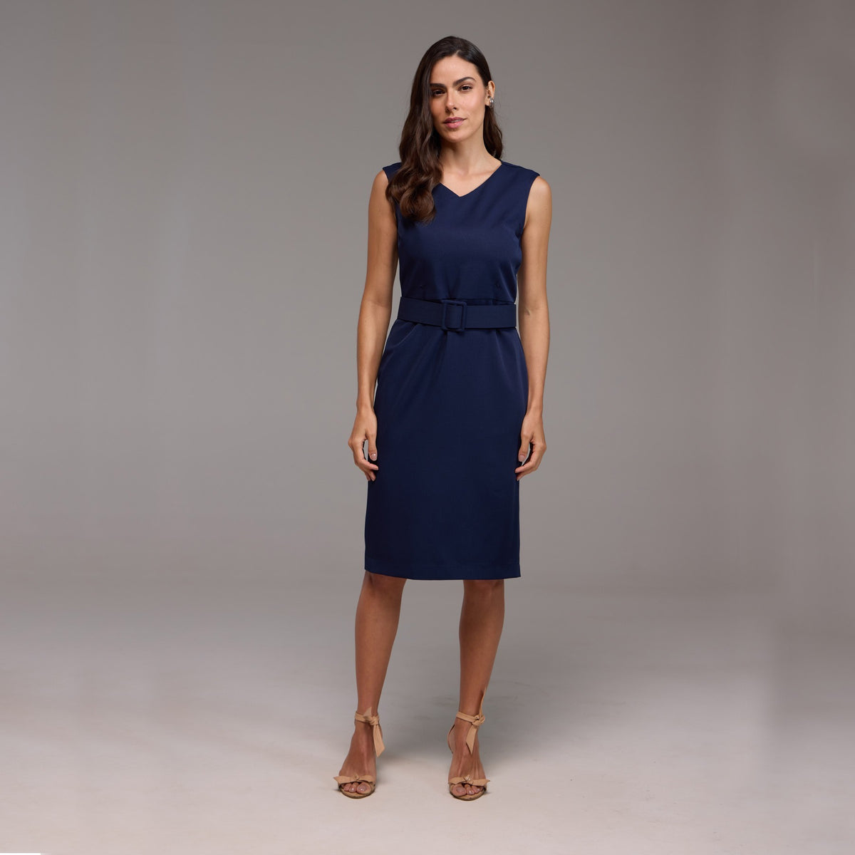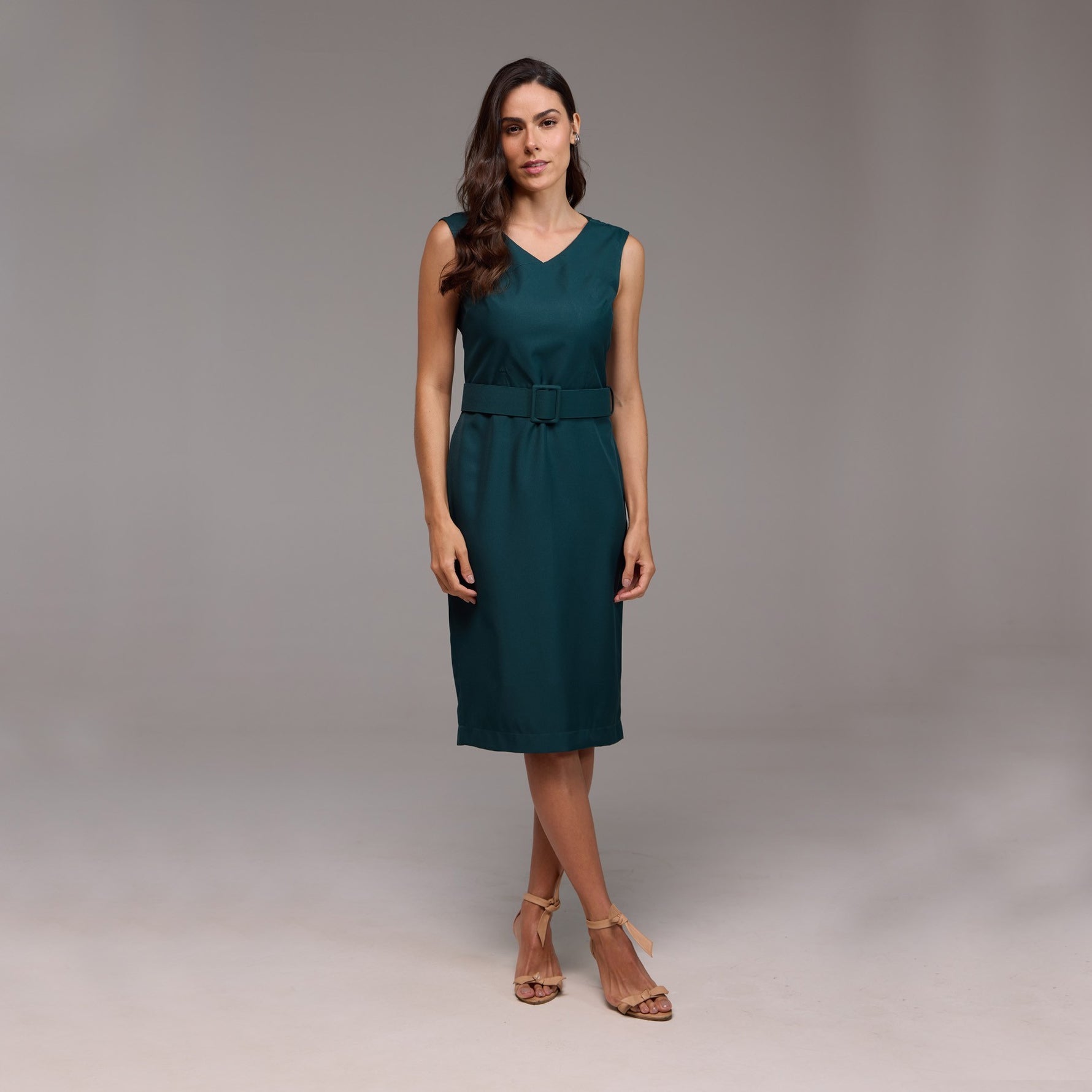 O decote em formato "V" acrescenta um toque de feminilidade, alongando a silhueta e destacando o colo de maneira delicada. O cinto, posicionado na altura da cintura, marca sutilmente a silhueta, valorizando as curvas naturais do corpo.
