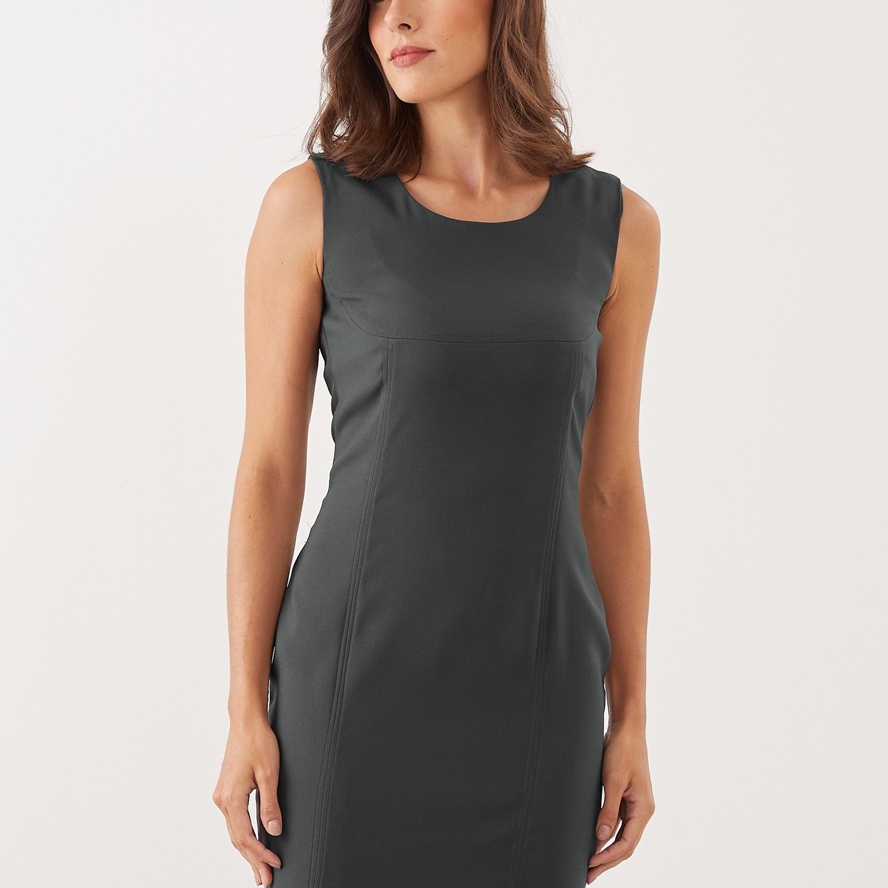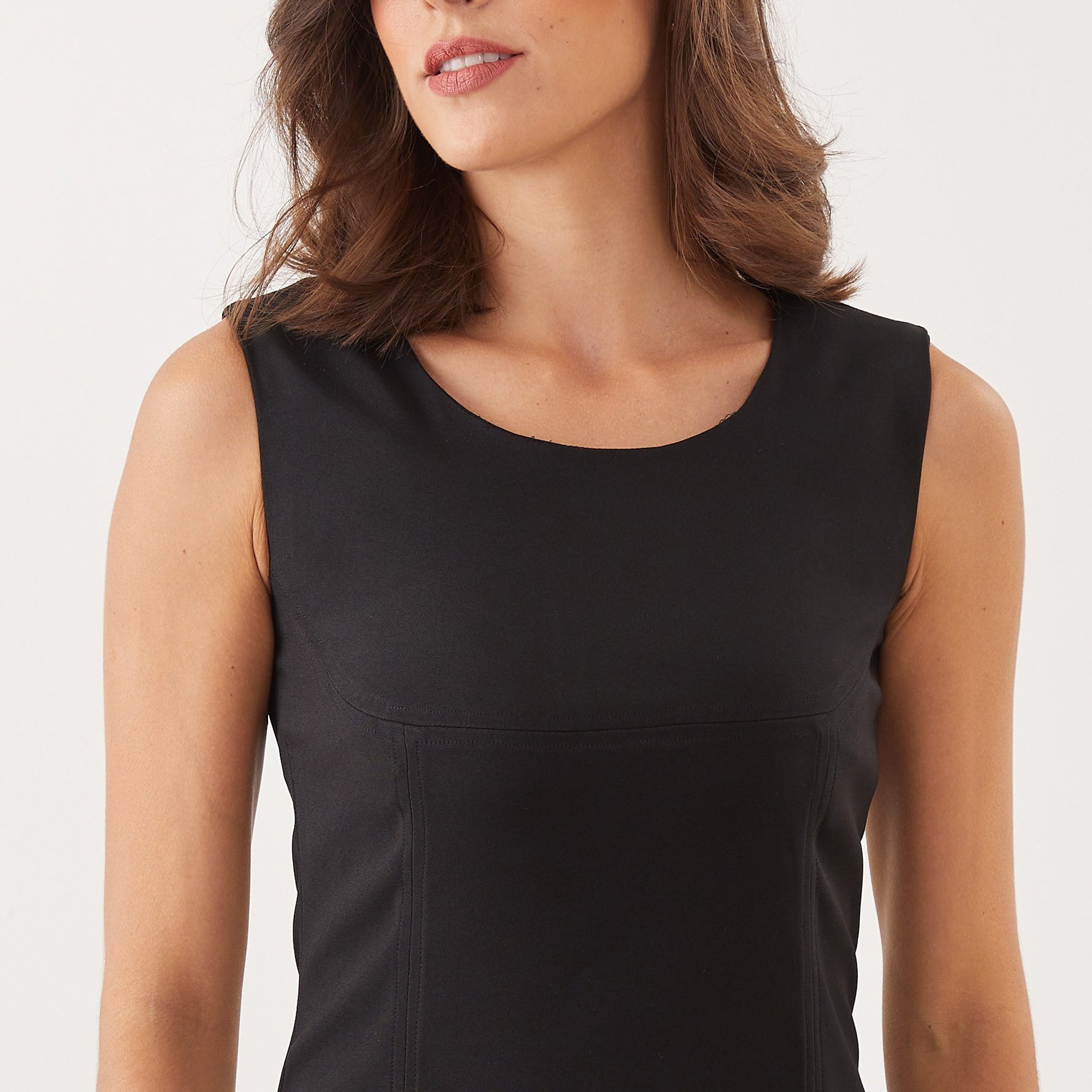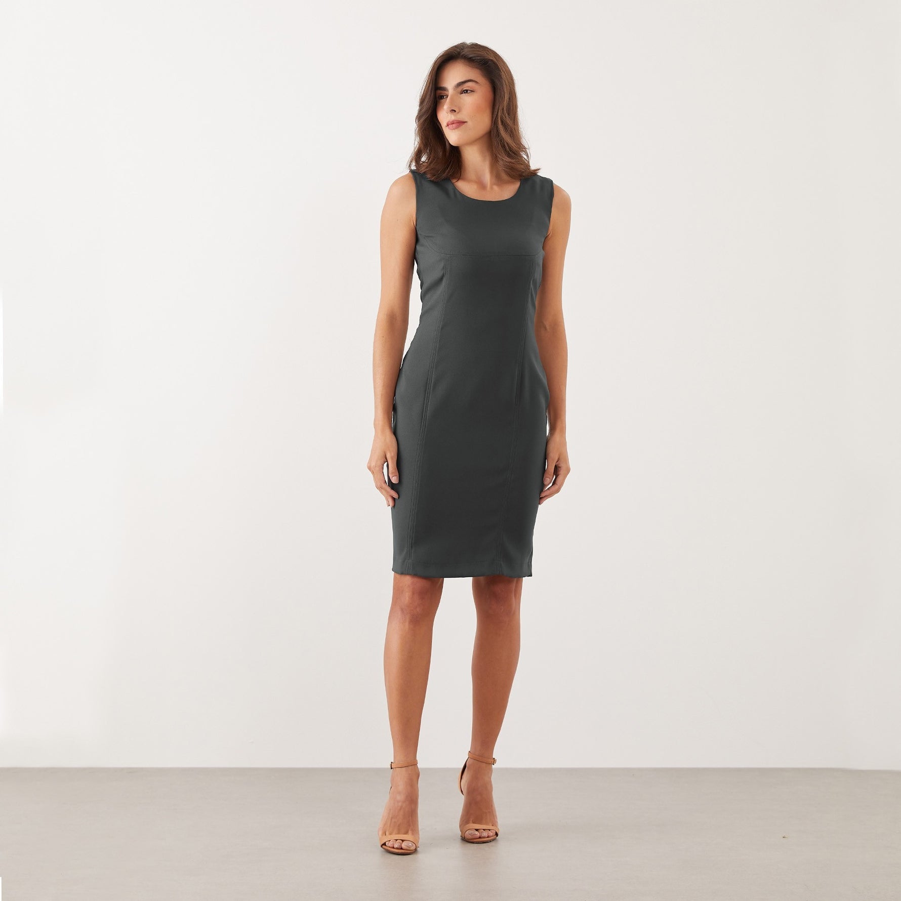 Sem mangas, o vestido realça os ombros, proporcionando uma aparência discreta e fresca para dias mais quentes.